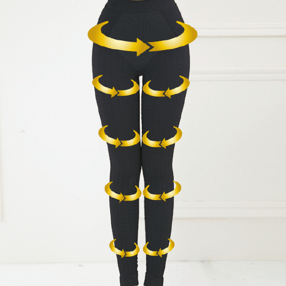 ビューティープレスは、生地全体が伸縮することによって、くるぶしからみぞおちまで「下半身全体」を満遍なくしっかりプレスする独自の加圧構造、かつ着るだけで身体の燃焼・代謝を促す特殊素材(ゲルマニウム・チタニウム)を生地に織り込み、効果的に「すらっとキレイな美脚」を手に入れるためのサポートをするための、着圧式レギンスです。