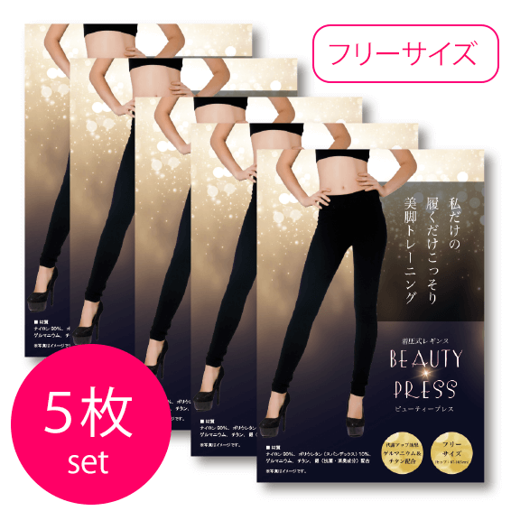 ビューティープレスは、生地全体が伸縮することによって、くるぶしからみぞおちまで「下半身全体」を満遍なくしっかりプレスする独自の加圧構造、かつ着るだけで身体の燃焼・代謝を促す特殊素材(ゲルマニウム・チタニウム)を生地に織り込み、効果的に「すらっとキレイな美脚」を手に入れるためのサポートをするための、着圧式レギンスです。